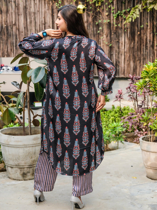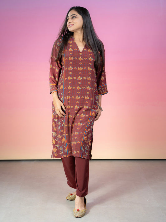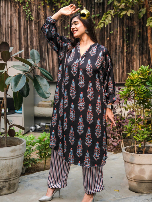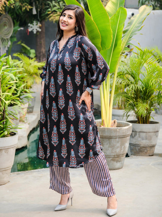 Each set includes a matching top and bottom — be it kurta with pants, crop top with skirt, or tunic with palazzos — stitched in rich prints and easy silhouettes.