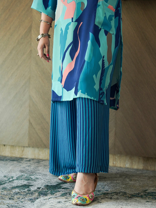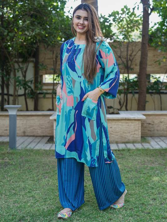 Each set includes a matching top and bottom — be it kurta with pants, crop top with skirt, or tunic with palazzos — stitched in rich prints and easy silhouettes.