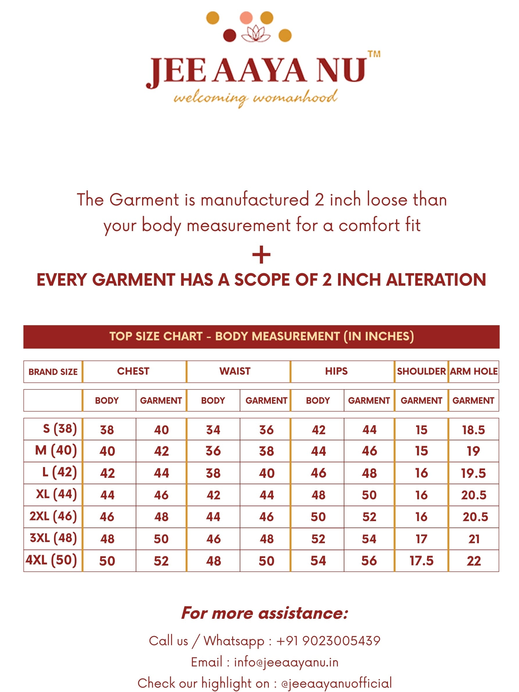 | Bottom | 38 inch long , Elasticated Pants with drawstrings (2.5 inch Hemline -with scope for 2 inch length increasing ) |